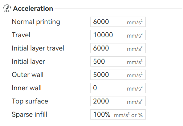 Is it possible to set separate accelerations for the first layer, outer wall, inner wall, and infill of a belt printer? I only see options for setting speed.
