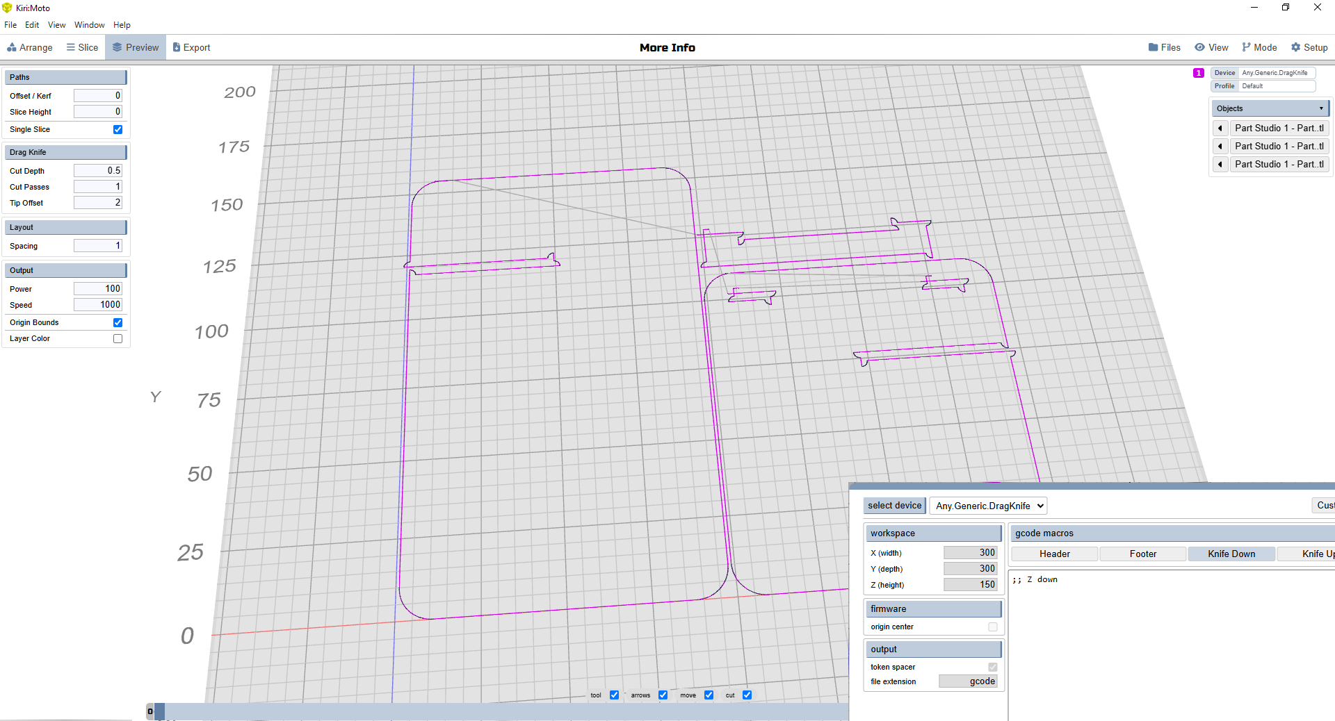 Between the start of discrete closed polylines, a G0Z5 is emitted. When a new polyline is started, a hardcoded G0Z-{depth} is emitted. Then the down macro is injected for each segment of cut with variable substitution. The up macro works as you would expect. But then there’s the G0Z5 as mentioned above.