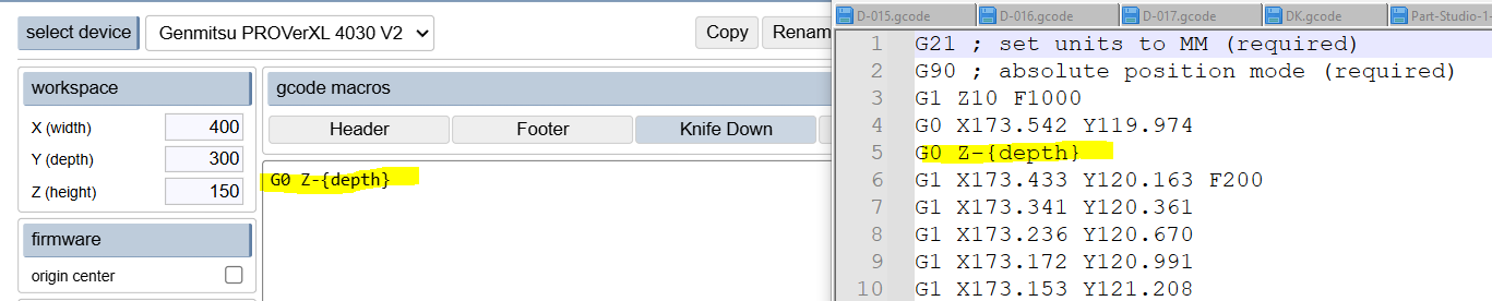 @stewart , first of all, thanks for replying this quickly. secondly i would like to know if i can use the G0Z-{depth} macro when using the knife down command and knife up (assuming the only thing is the absolute vertical position of the tool when issuing the G0 Z command, thus only changing if this is a negative [down] or a positive [up].