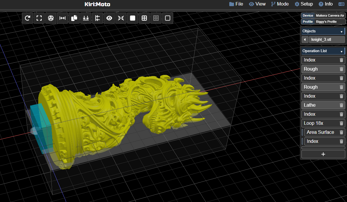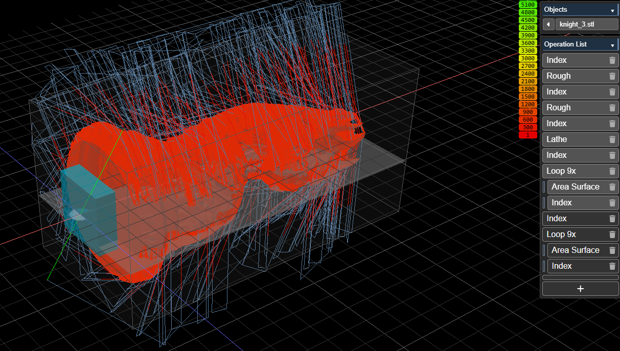 I’m going to make the horse in 3 passes: rough/lathe, erea 1-9 and area 10-18 generation of the NC code was fast and flawless.