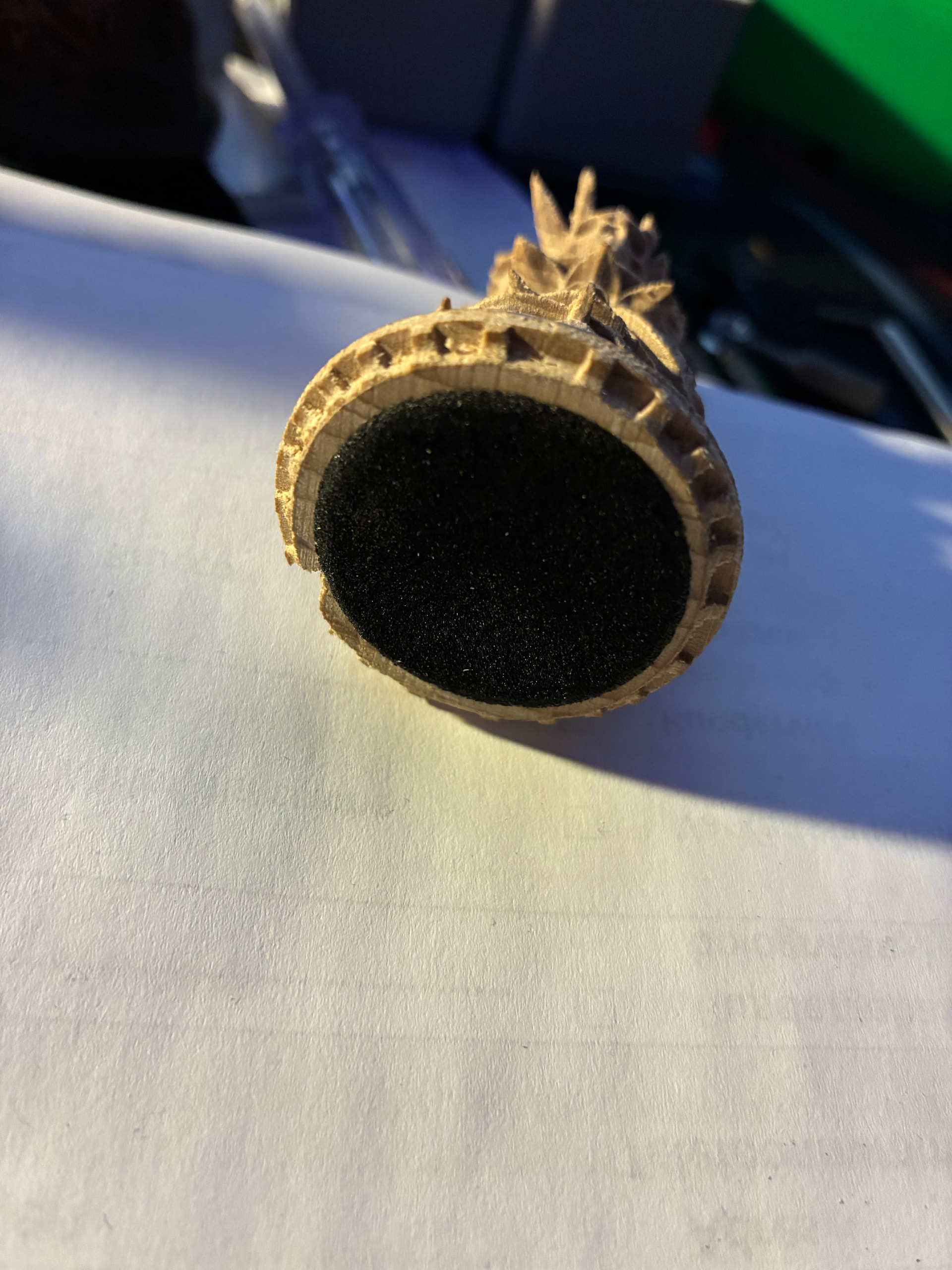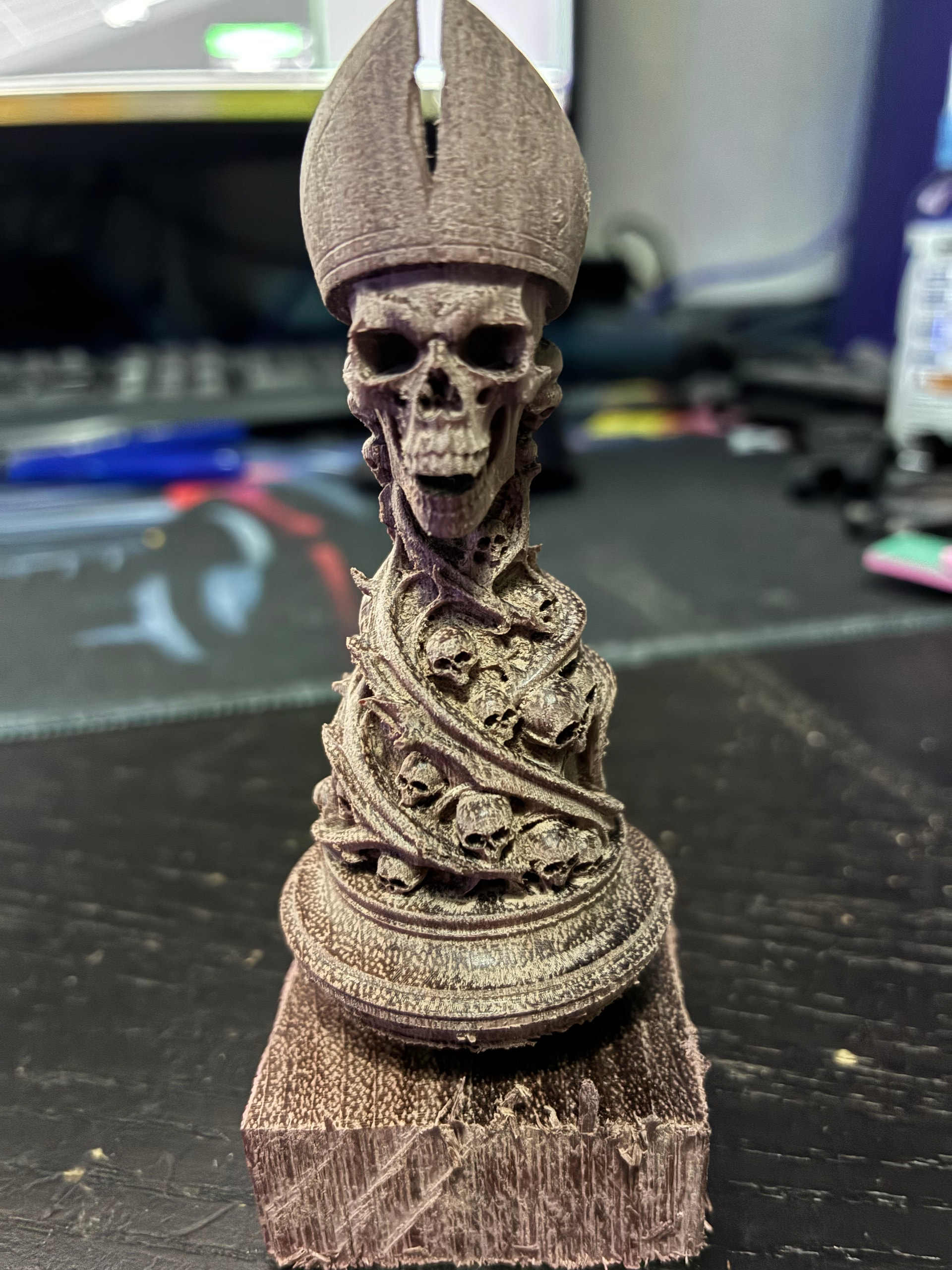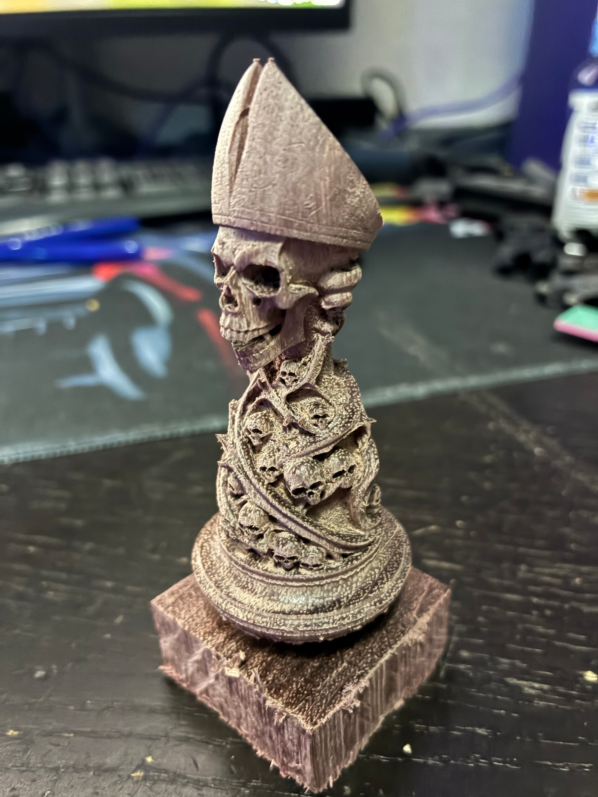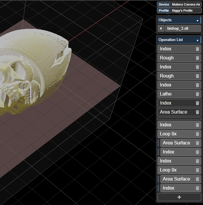 The bishop is ready, hot off the CNC and I’m amazed how good a job the Kiri:Moto ball-nose algorythm did (and you, Stewart!) There is no need for the 45 degree rig, the top has a bit too much stock left accoring to the model, but it’s in such a nook nobody will ever notice it, and I think I’ll do more damage by trying to get it out, the round head is just perfect, also the hat is just perfect, it’s totally perfect (and fast too at 1000 speed area).