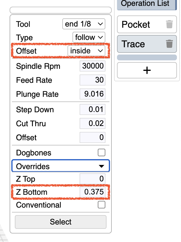 thought it was solved but the first step in the Pocket is plunge to Z .375 inch rather than start the cutting at .75 inch….would certainly be a machine crash…..Outline starts at the top….the Z offset override does not work for pocket but it does for outline