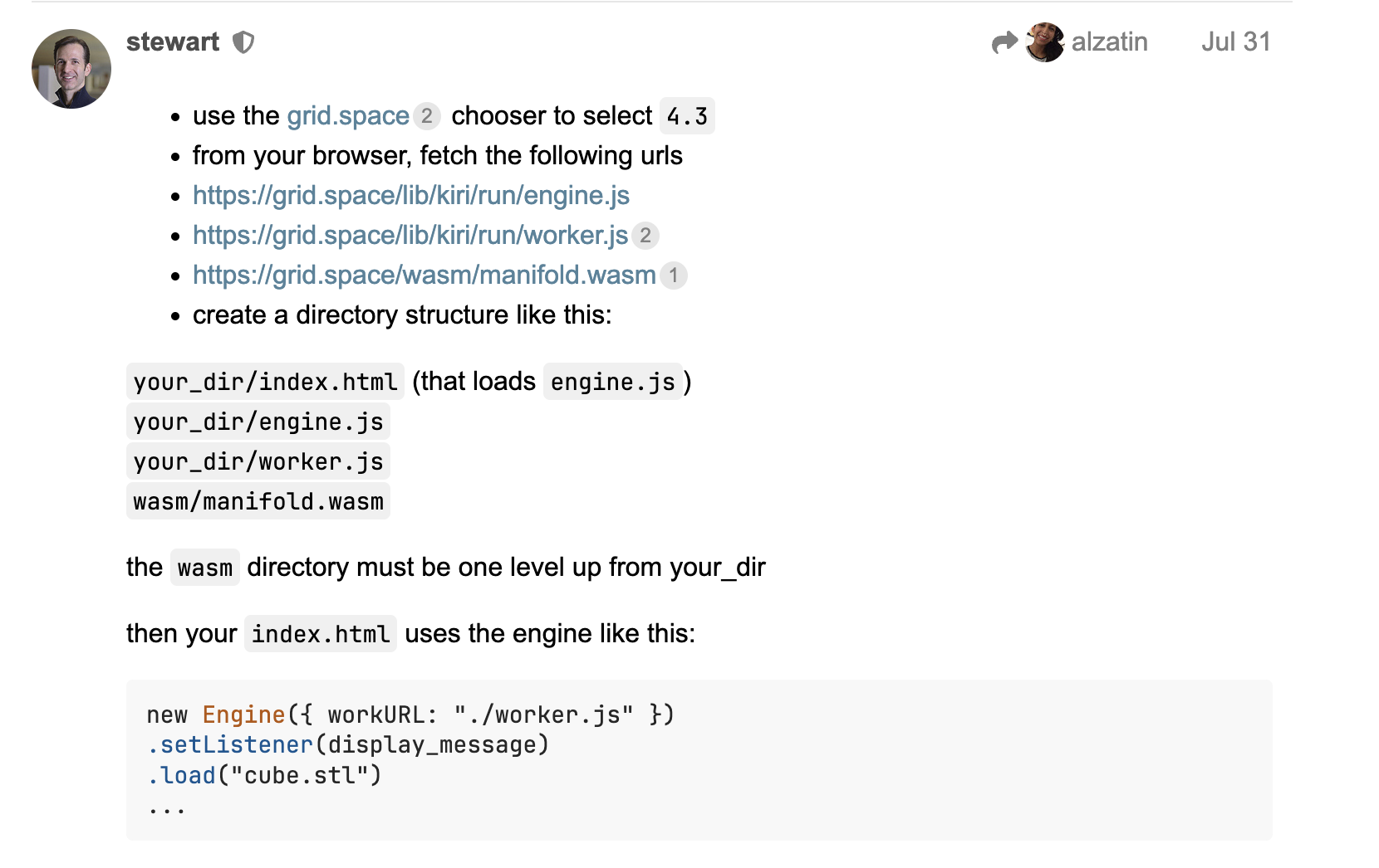 I’ve been trying to update the engine and worker files, which i run locally and set up back in july following this example (image). However, when i pulled the new files today to keep up with some of the most recent updates, I’m now getting an empty gcode file. Is this still the correct setup, is there possibly a file i’m missing to update. The engine seems to load correctly as 4.3.4 but simply not giving correct results.